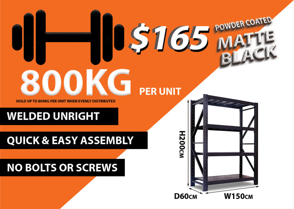 1.5m x 2m x 0.6m Garage Shelving, 800KG Load Capacity: (free upgrate to 1,200kg rated uprighs) $165/unit